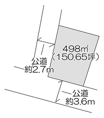 | 接道状況等 | 角地、西側 公道 幅員約2.7m接面27.4m、南側 公道 幅員約3.6m接面18m | ||